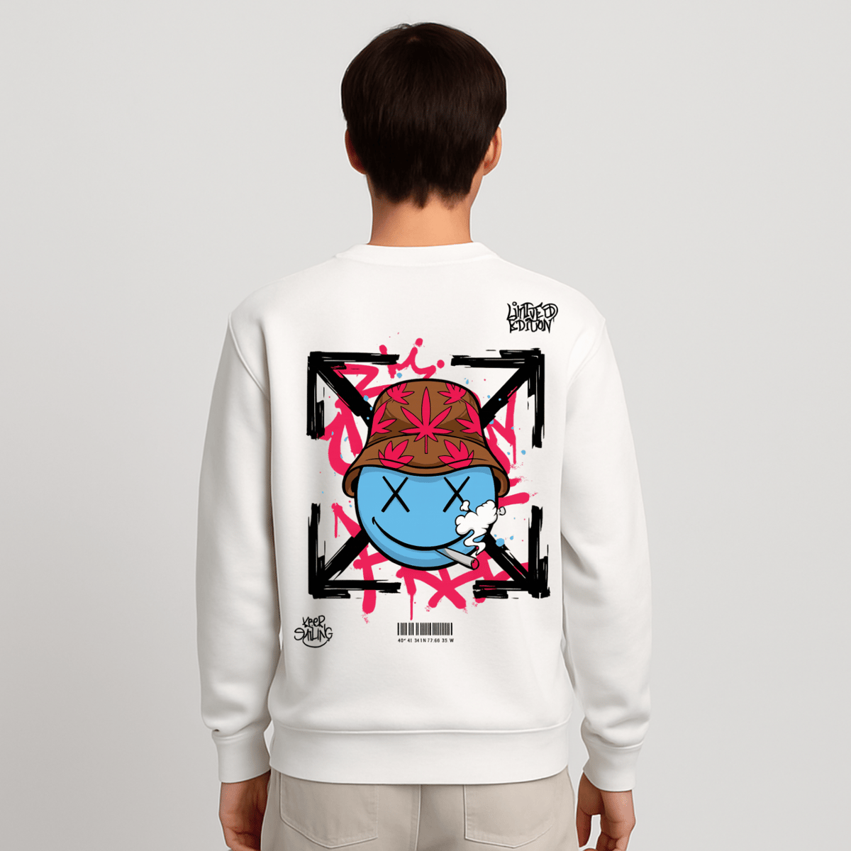 O moletom "Limited Edition – Smiley Chapado" da OxVibe mistura sarcasmo visual, arte urbana e linguagem pop underground.
