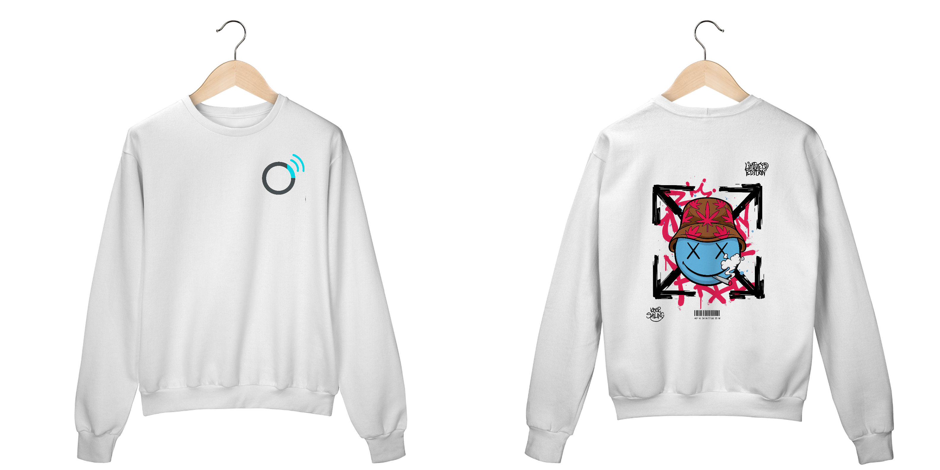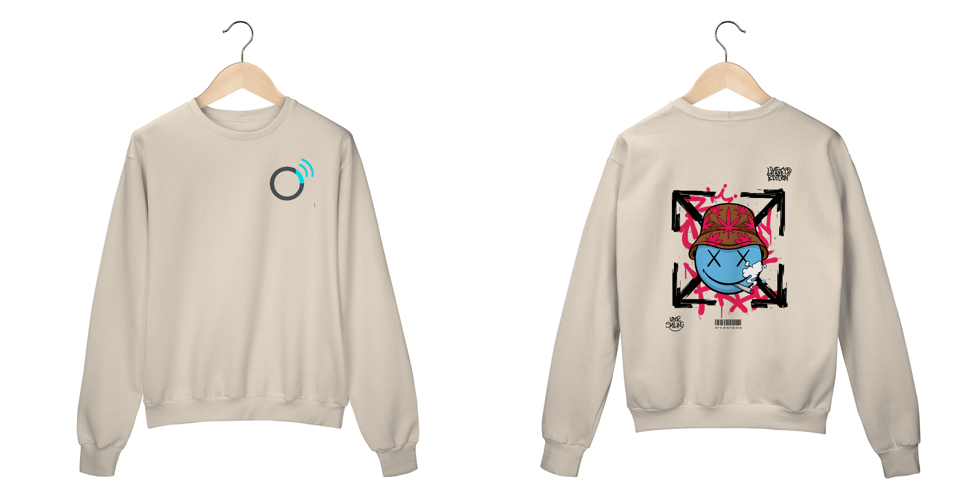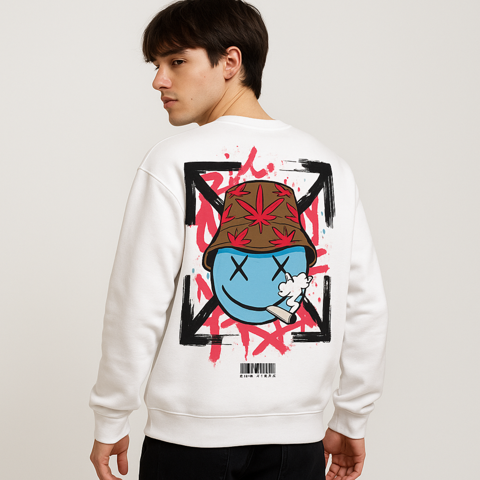 A estampa apresenta um smiley chapado, reinterpretado com linguagem gráfica alternativa e atmosfera urbana. A arte mistura humor ácido, cultura pop e referências da arte de rua, criando uma composição visual provocadora que traduz atitude dentro do universo streetwear.