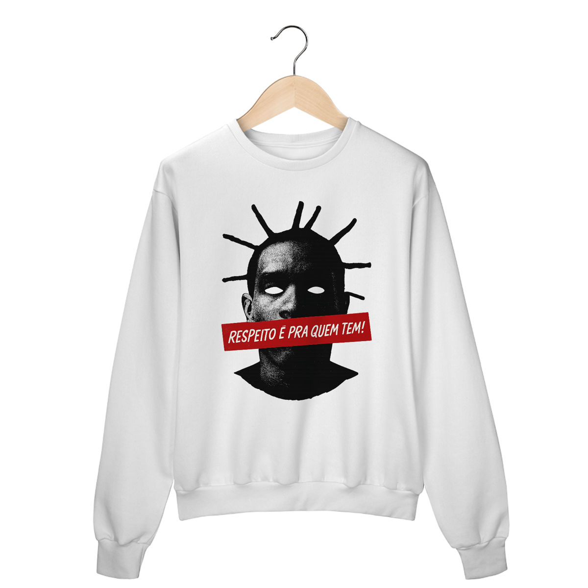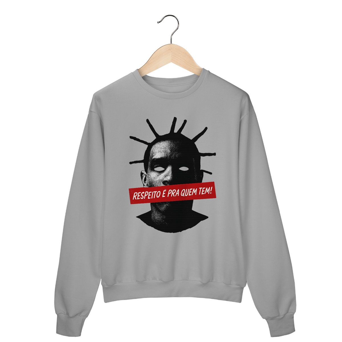 O Moletom Respeito é Pra Quem Tem da OxVibe é uma homenagem visual ao poder de quem impõe presença sem pedir espaço. Inspirado na estética de resistência do rap nacional, a arte traz o rosto em contraste brutal, olhos vazios e a frase em vermelho como corte gráfico direto na voz.