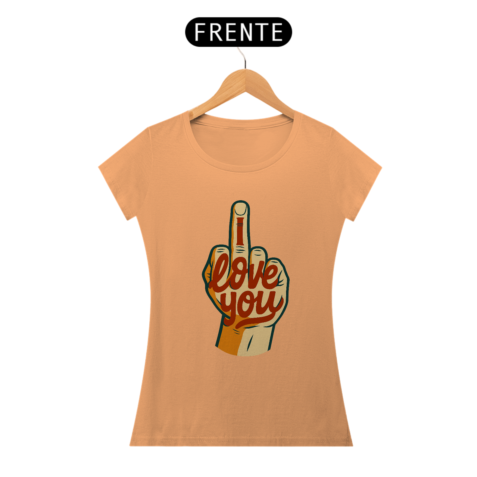 A estampa apresenta a frase “I Love You” reinterpretada com humor ácido: um gesto direto de dedo do meio sob uma tipografia retrô que subverte o clássico símbolo de afeto. A composição mistura provocação gráfica, linguagem visual urbana e atitude irreverente, criando uma arte que transforma romantismo em crítica visual.