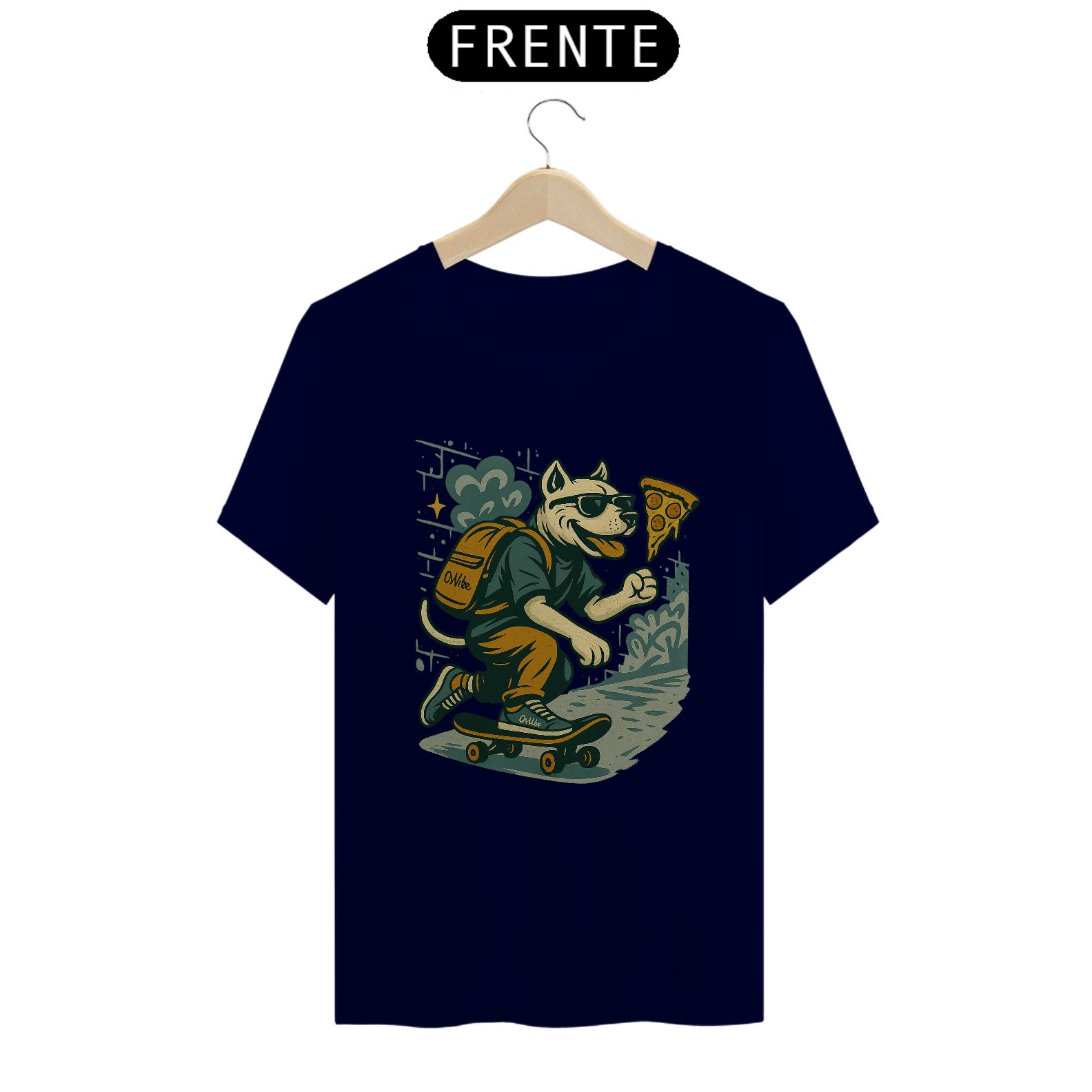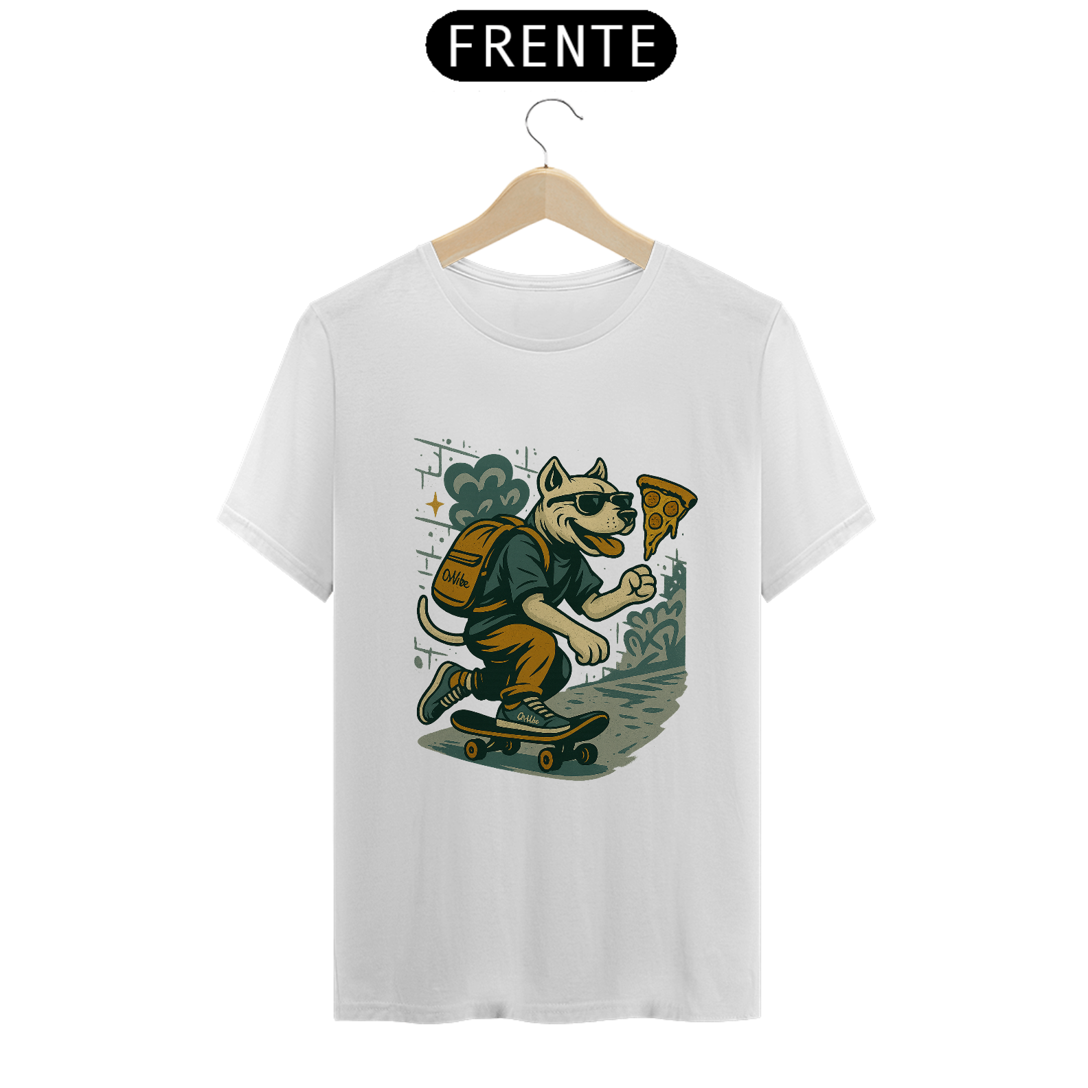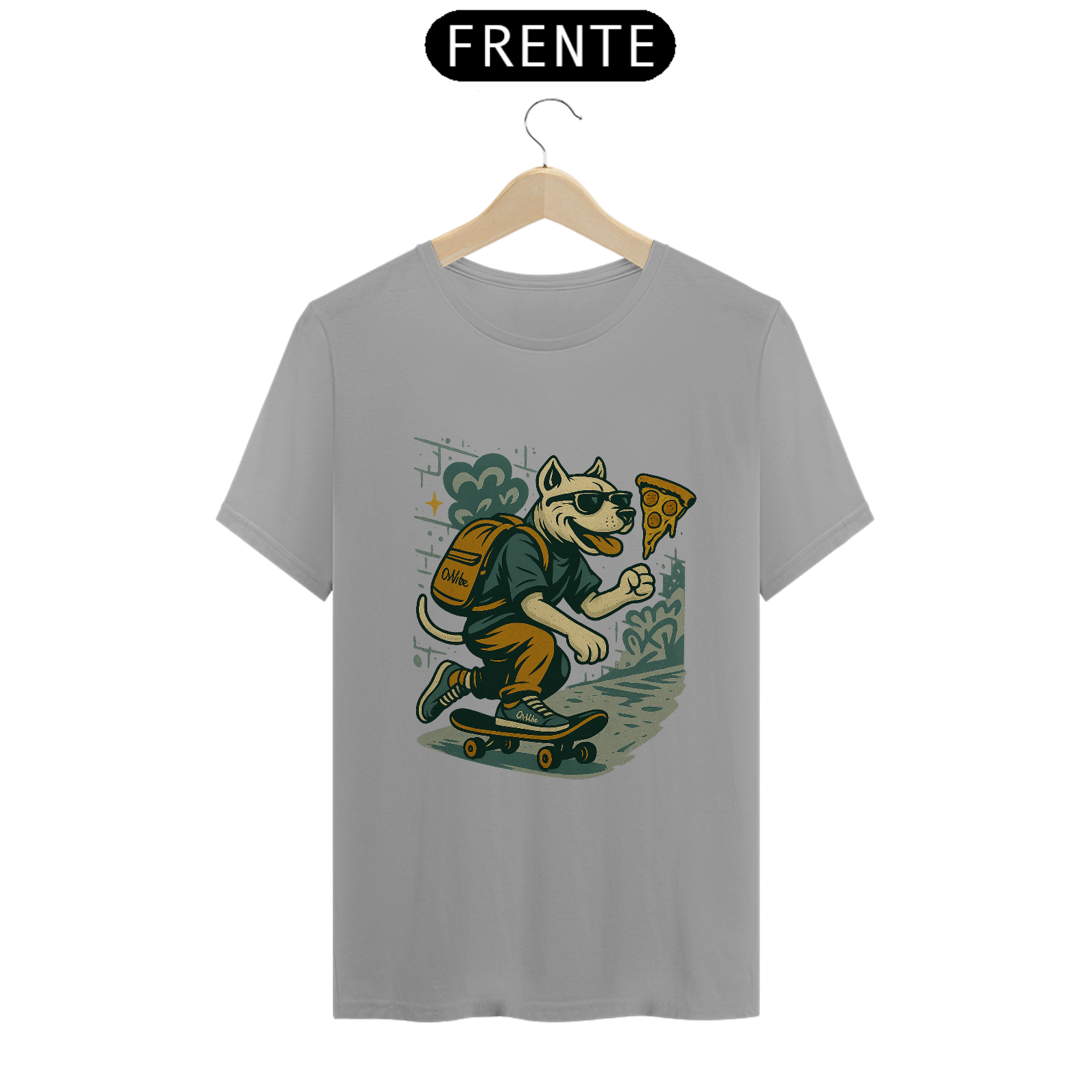 A estampa apresenta um personagem canino skatista, usando boné, tênis e mochila enquanto corre de skate atrás de uma fatia de pizza. A composição mistura irreverência, cultura skate e linguagem gráfica urbana, criando uma arte divertida que ironiza a pressa do cotidiano e o excesso de hype.