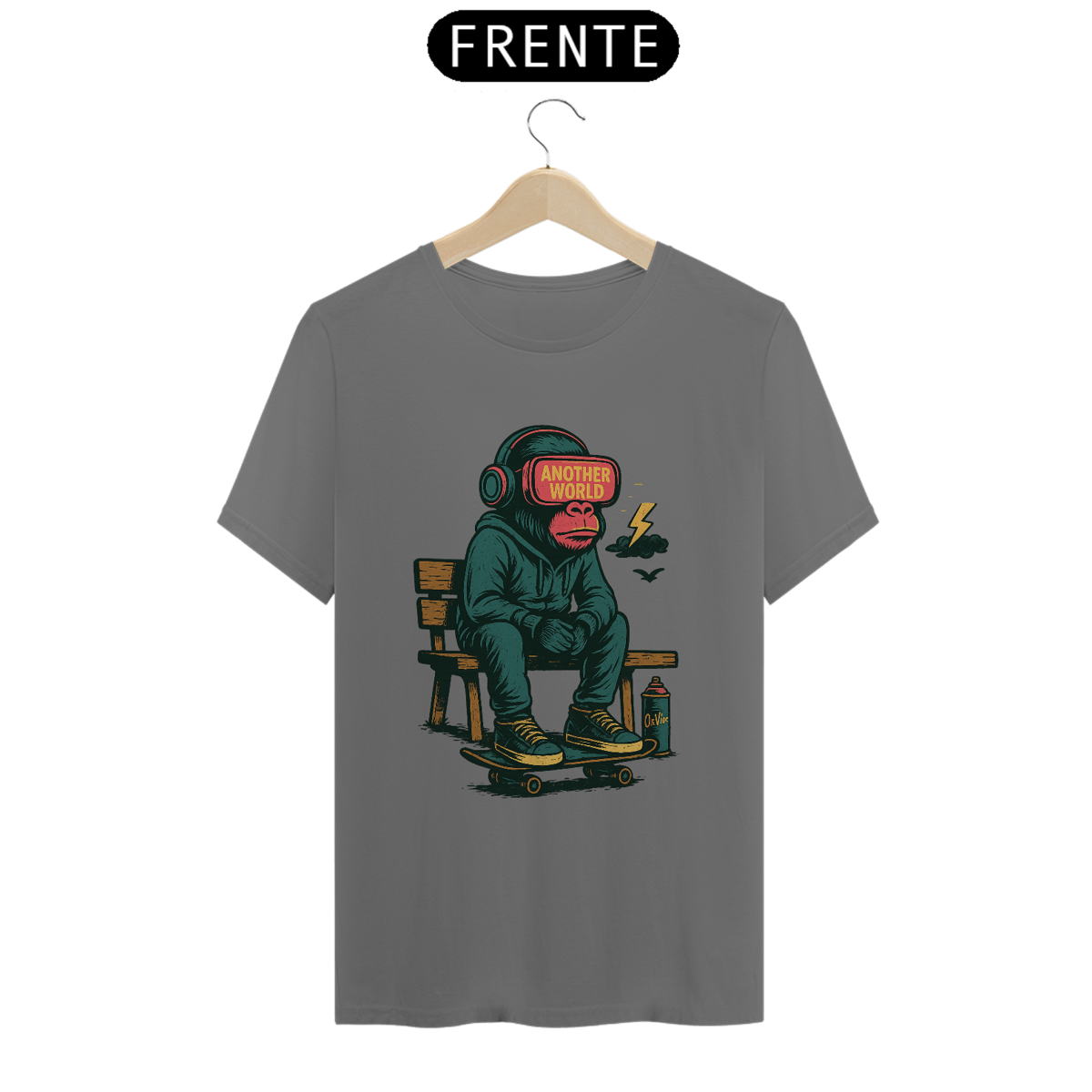A Camiseta Estonada Another World da OxVibe traduz o peso de estar no agora com a cabeça em outro lugar. A arte traz um gorila em trajes urbanos, sentado no banco com skate, fones e um óculos de realidade virtual que estampa “Another World” — cena que mistura isolamento, tecnologia e crítica social no melhor estilo visual de rua.