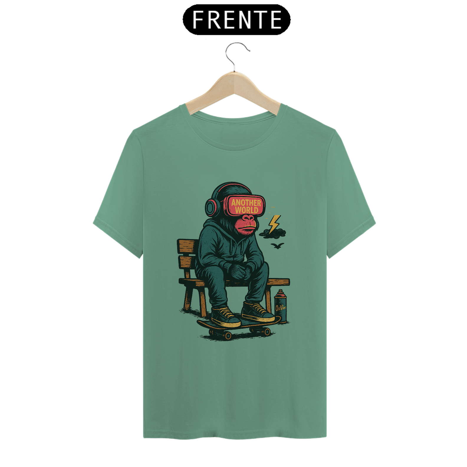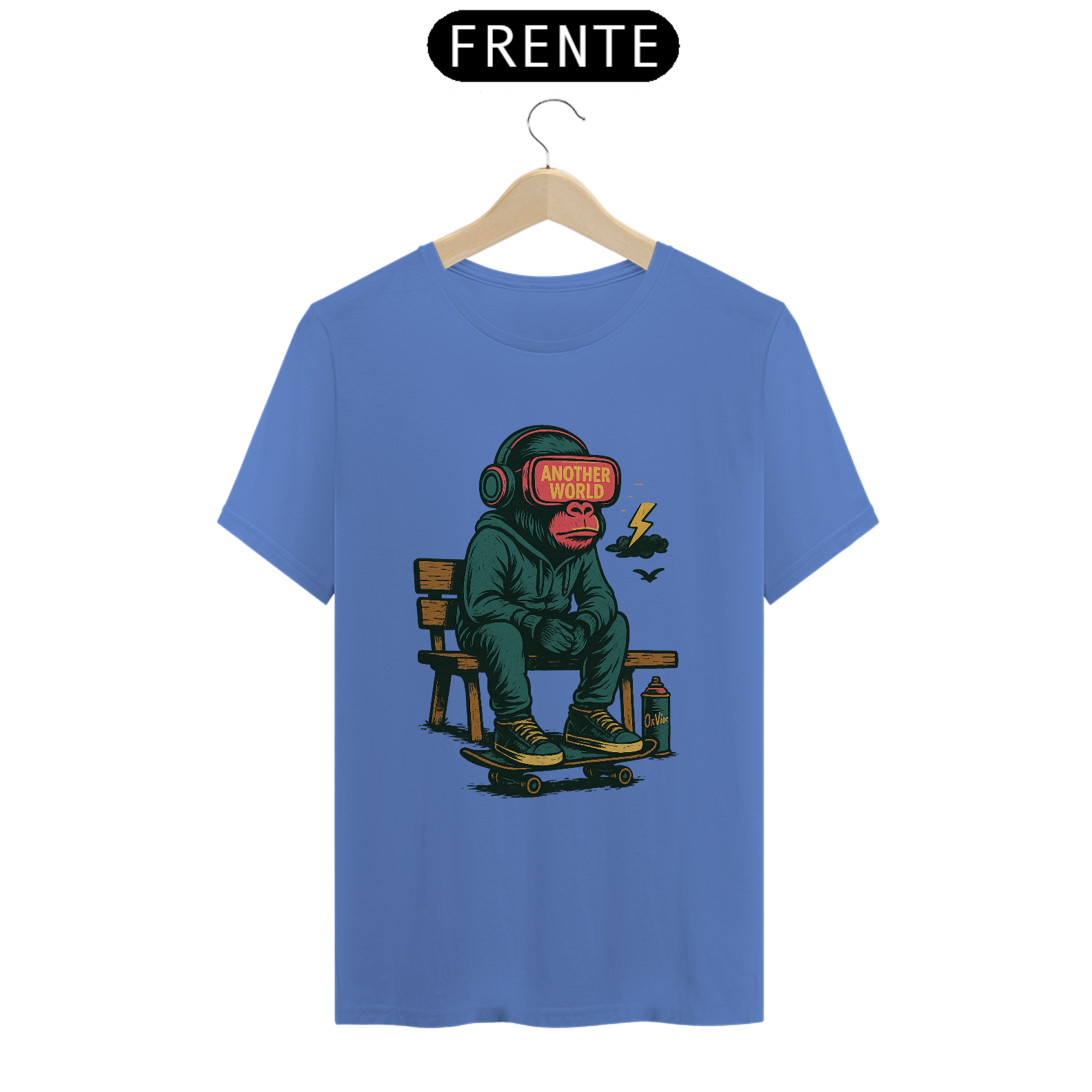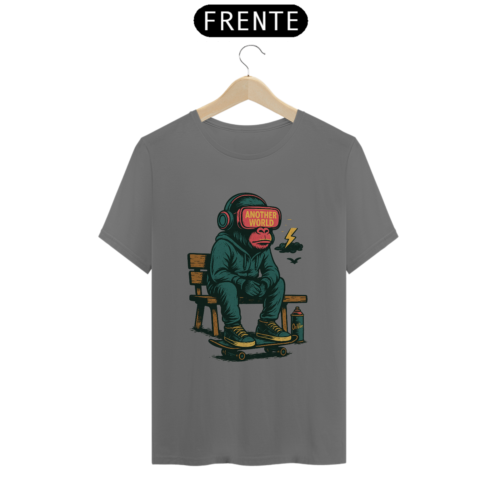 A estampa apresenta um gorila em trajes urbanos sentado em um banco com skate, fones de ouvido e um óculos de realidade virtual com a frase “Another World”. A cena mistura tecnologia, isolamento e reflexão social, criando uma composição visual que traduz a sensação de estar presente no mundo físico enquanto a mente busca outra realidade.