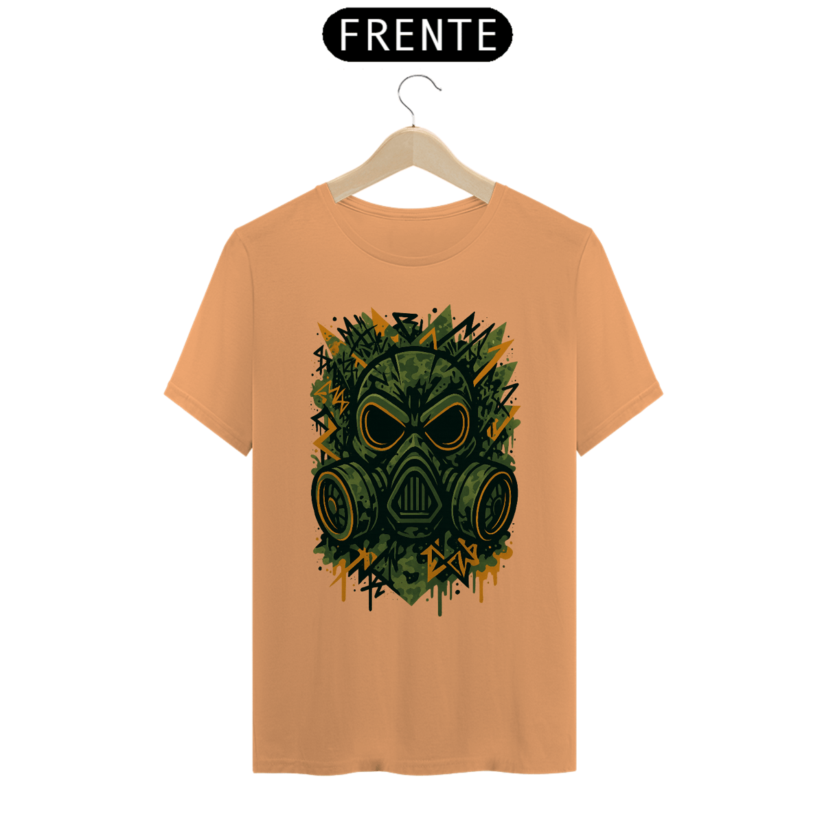 A Camiseta Máscara Urbana OxVibe é um manifesto estampado no peito — uma fusão entre o estilo militar e o caos das ruas. A arte traz uma máscara de gás em camuflado verde-oliva, com traços em laranja vibrante e fundo marcado por pichação desconstruída.