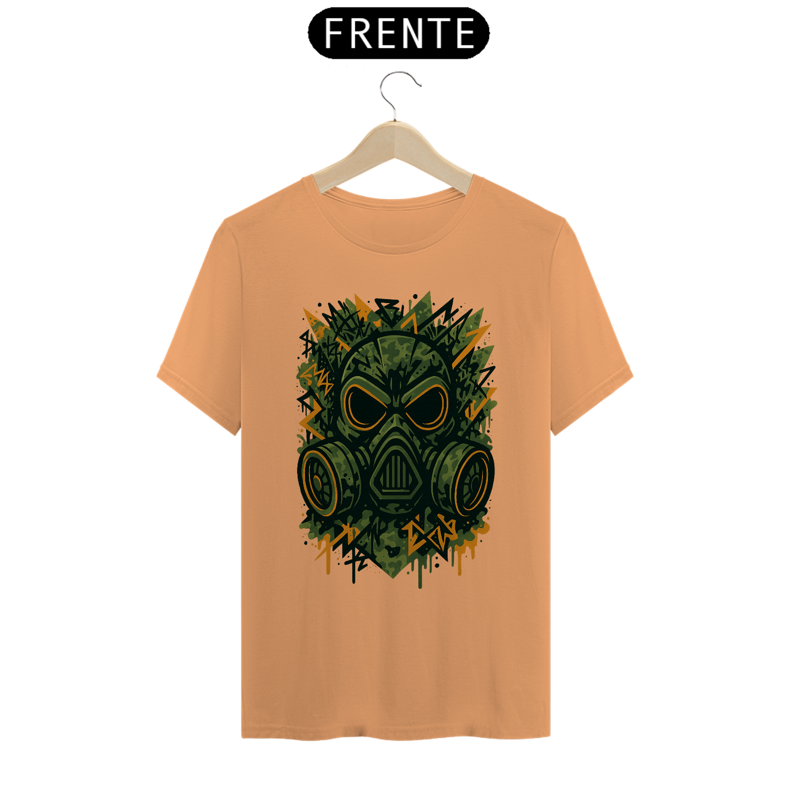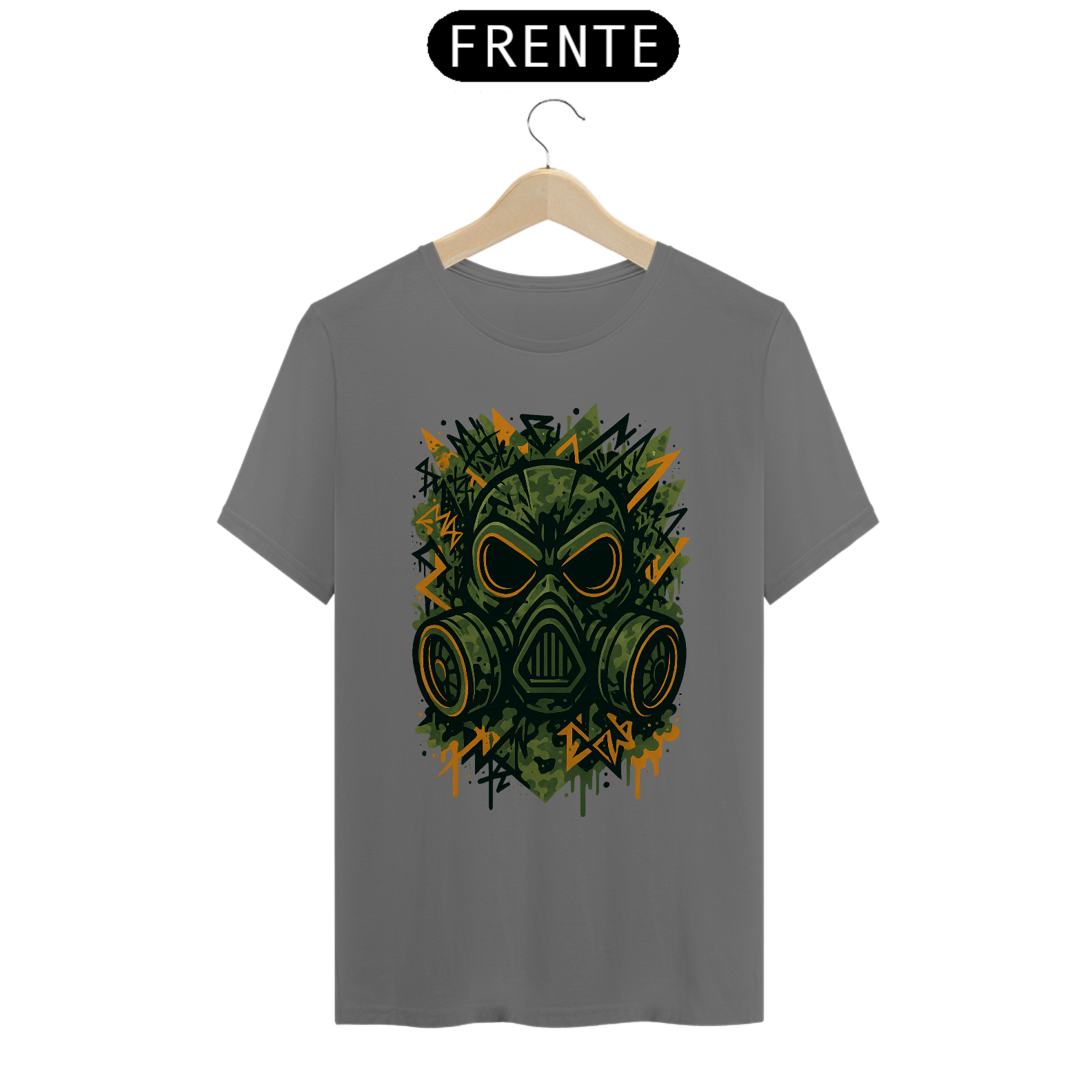 A estampa apresenta uma máscara de gás em camuflado verde-oliva com traços em laranja vibrante, sobre um fundo marcado por pichação desconstruída. A composição mistura referências militares, arte urbana e atmosfera de confronto visual, criando uma peça com presença forte e identidade alternativa.