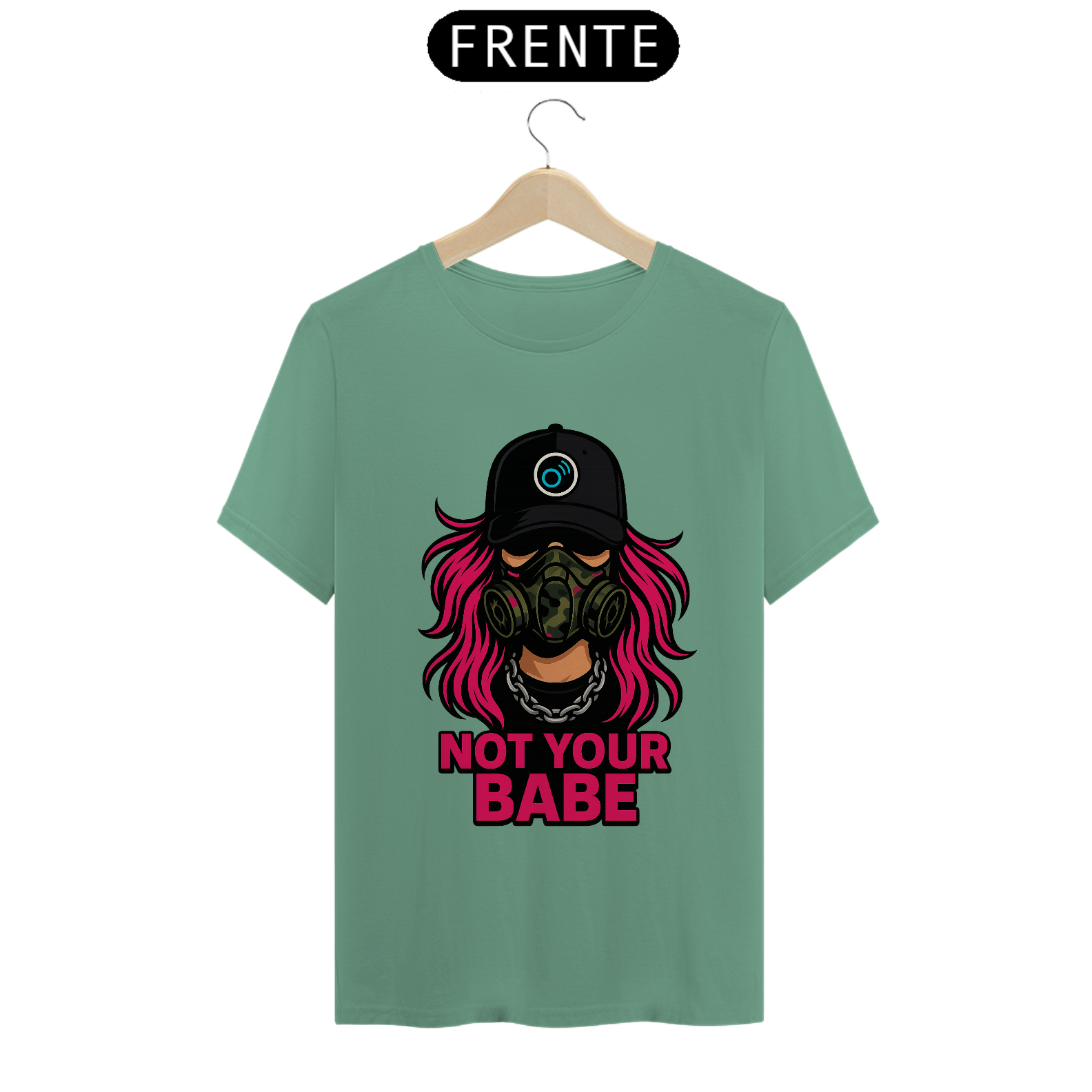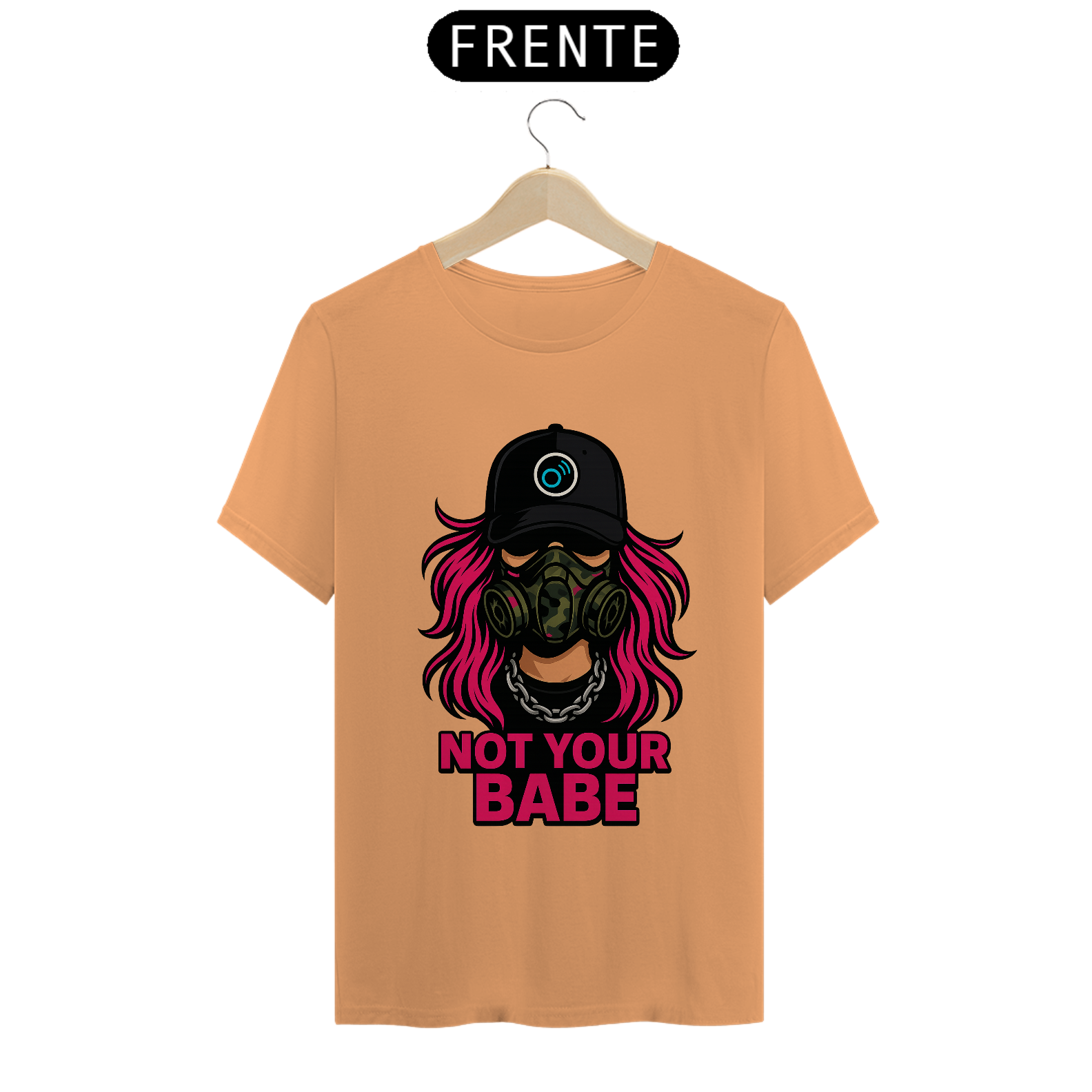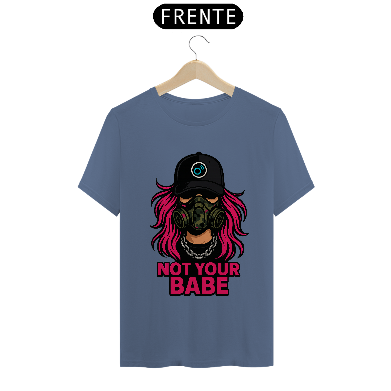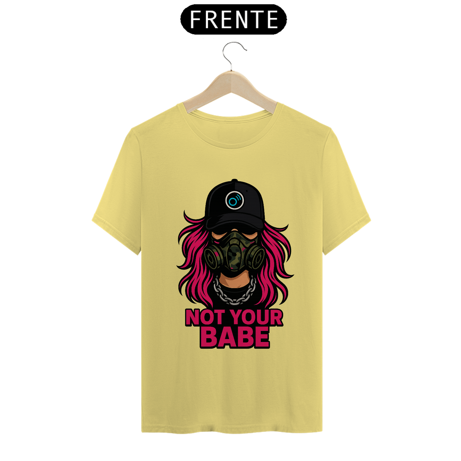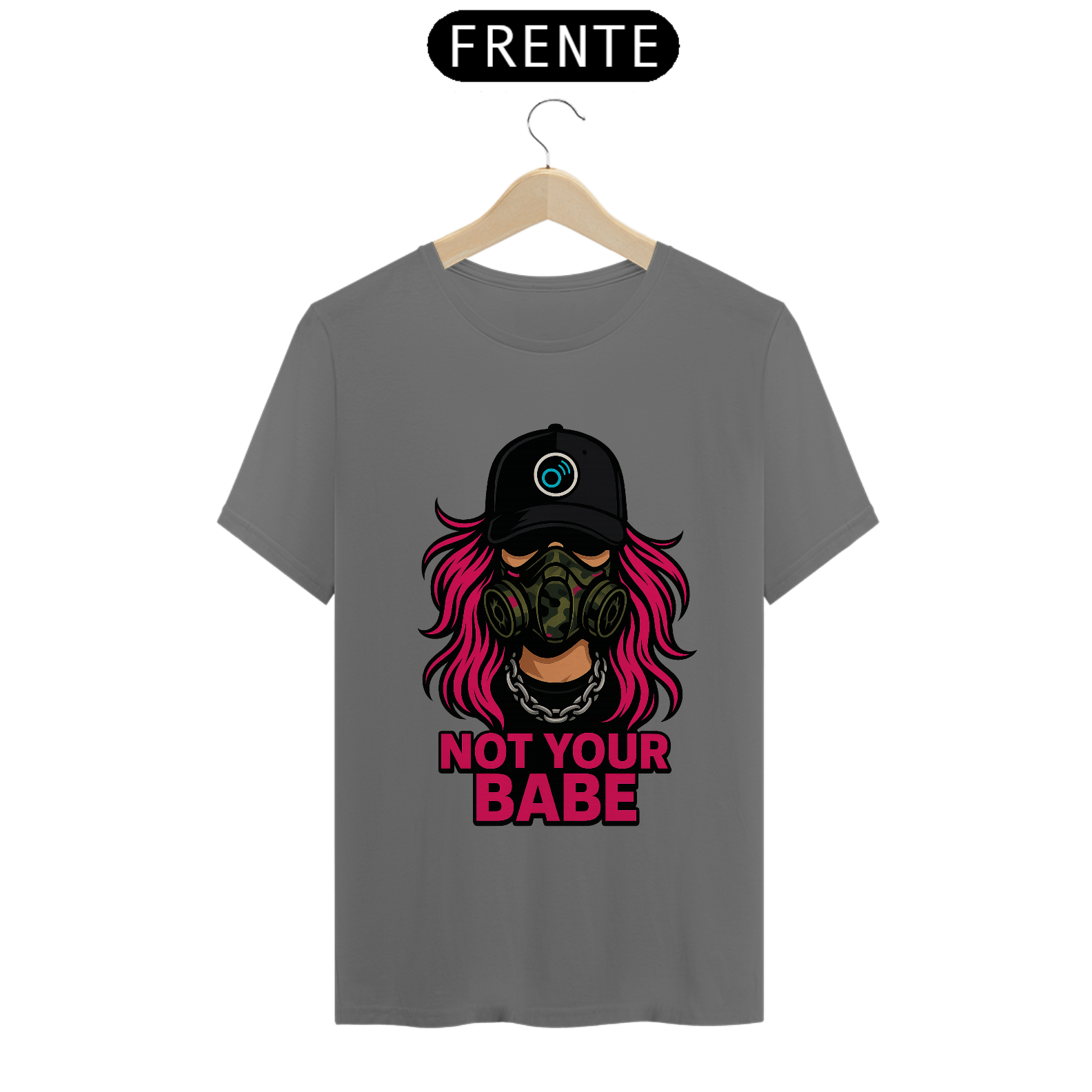A estampa apresenta uma figura forte com cabelo rosa neon, máscara tática camuflada e corrente de aço, acompanhada da frase “NOT YOUR BABE” em caixa alta. A composição cria um visual de confronto com linguagem gráfica de rua, misturando sarcasmo, rebeldia e presença feminina dentro da estética urbana.