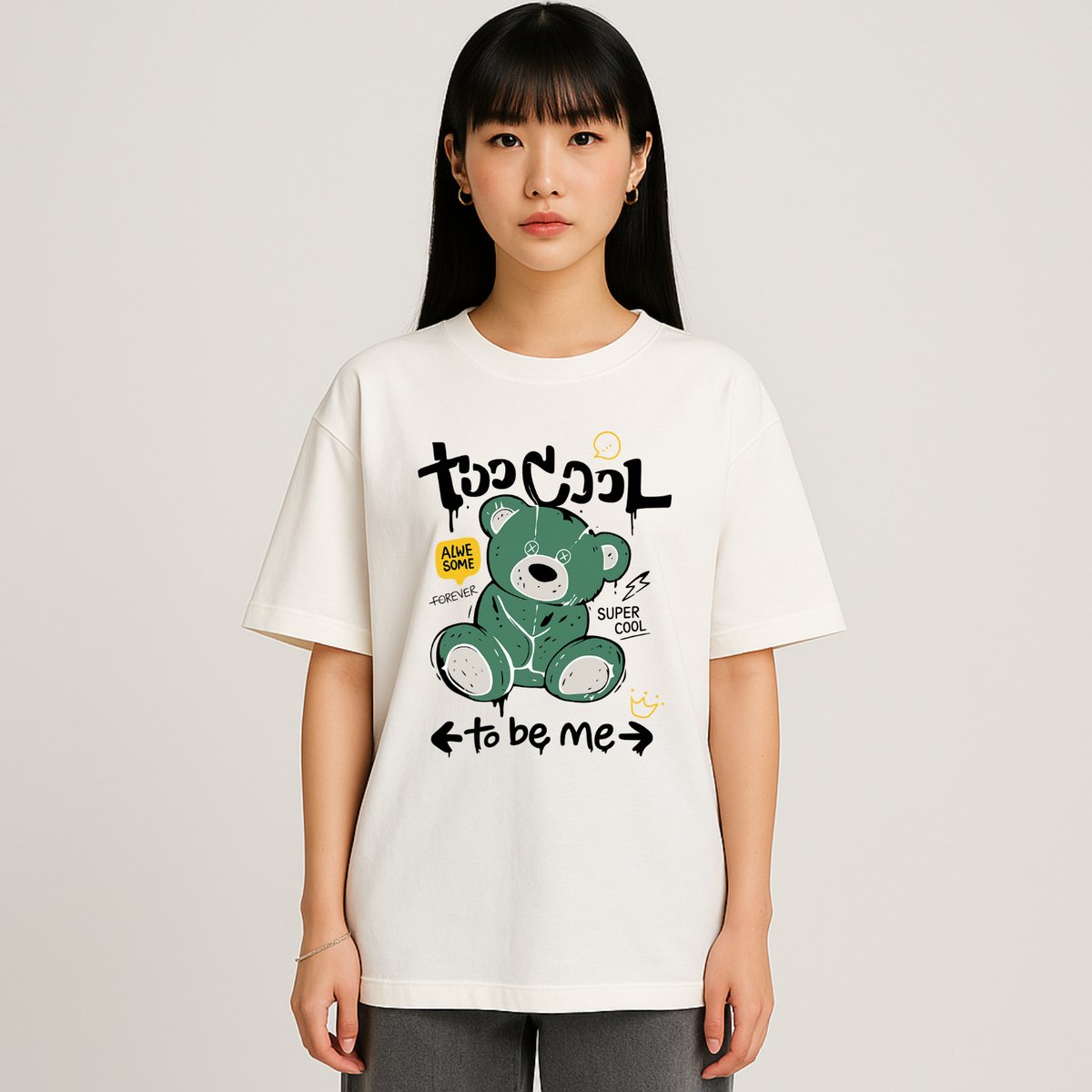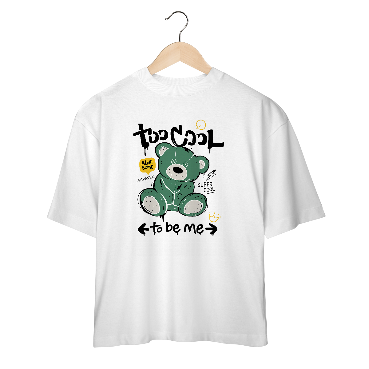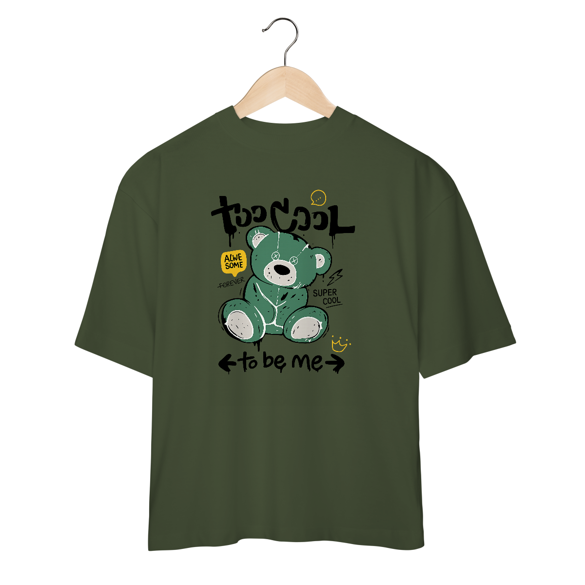 A Camiseta Oversized “Awesome Bear” da OxVibe leva um ícone da infância para o universo do streetwear brutalista. A ilustração mostra um urso de pelúcia verde, com costuras rasgadas, olhos em X e balões grafitados, criando um contraste entre doçura e decadência.