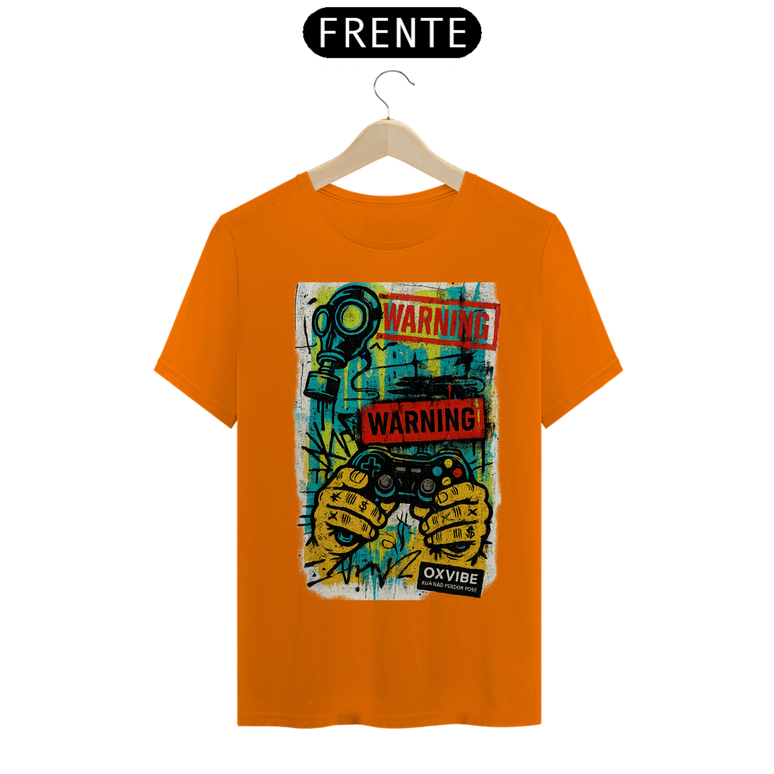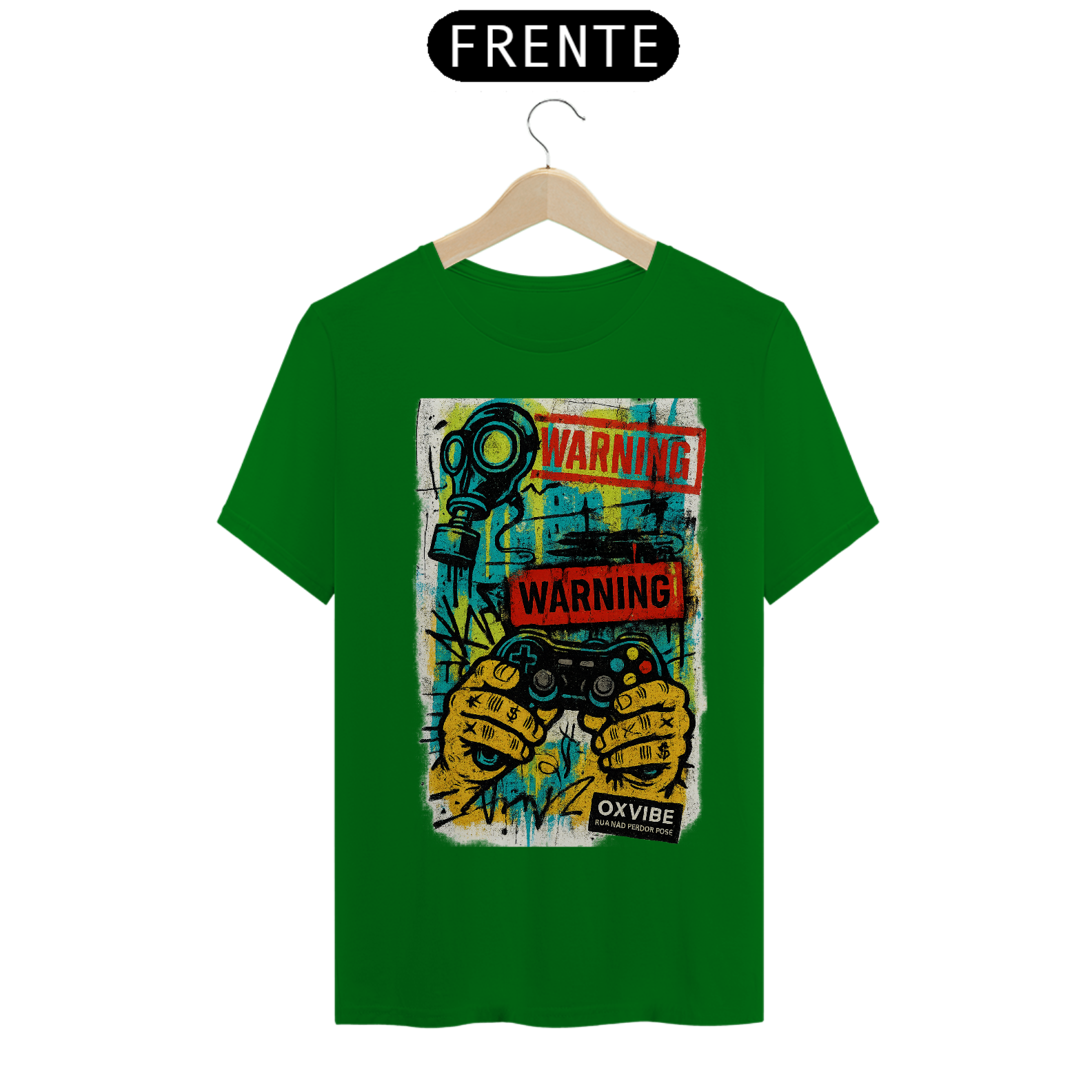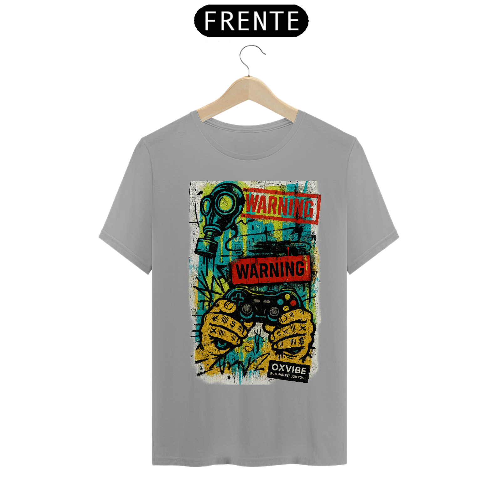 A estampa apresenta mãos tatuadas segurando um controle de videogame, acompanhadas por faixas de “WARNING” em vermelho intenso e uma máscara de gás ao fundo. A composição utiliza traços distorcidos, pinceladas sujas e cores vibrantes sobre textura desgastada, criando uma arte com atmosfera caótica e linguagem visual urbana.