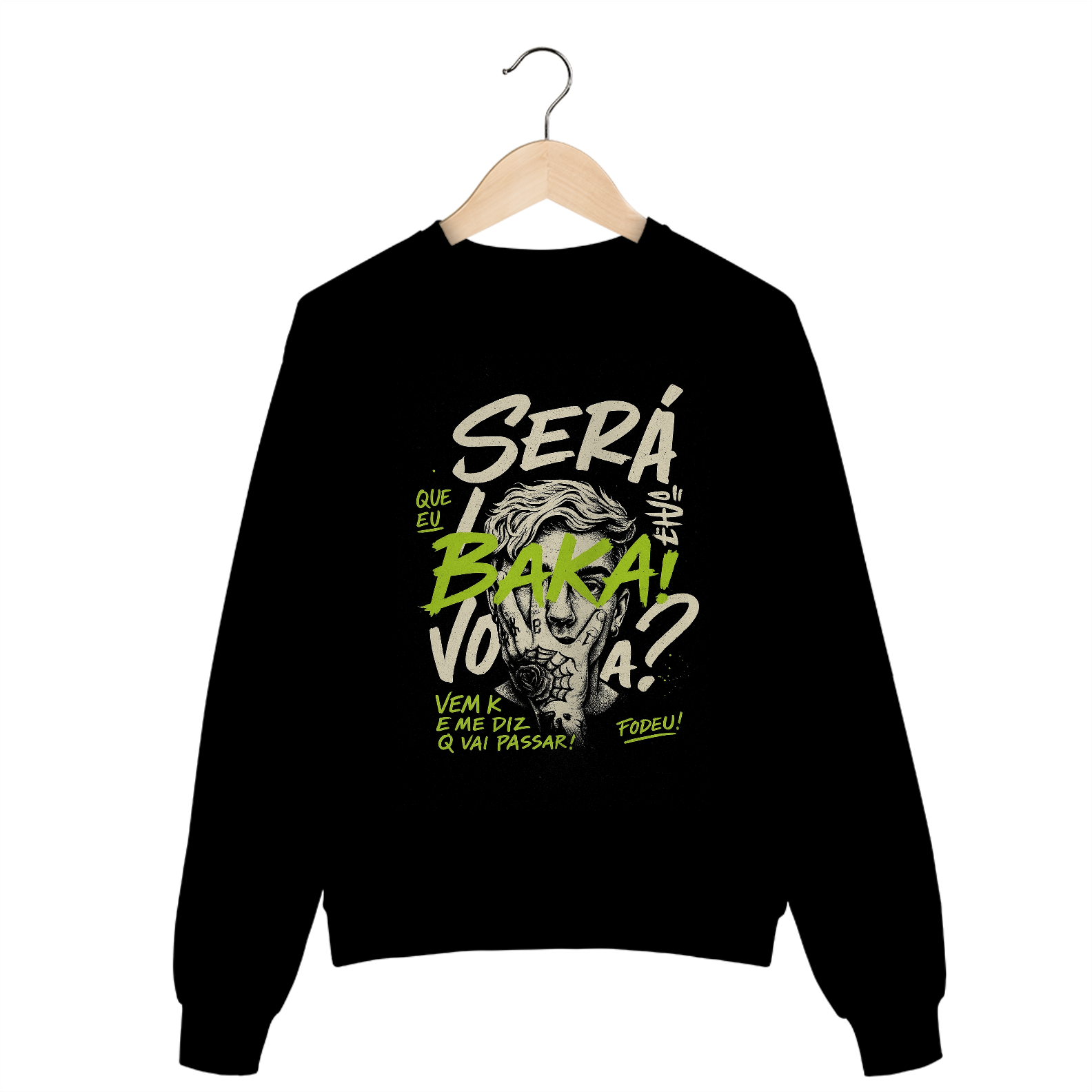 A estampa apresenta a frase provocadora “Será Que Eu Sou BAKA?”, construída com linguagem gráfica intensa e atmosfera urbana. A composição mistura sarcasmo, humor ácido e crítica social, criando uma peça que expressa atitude e identidade dentro do universo street.