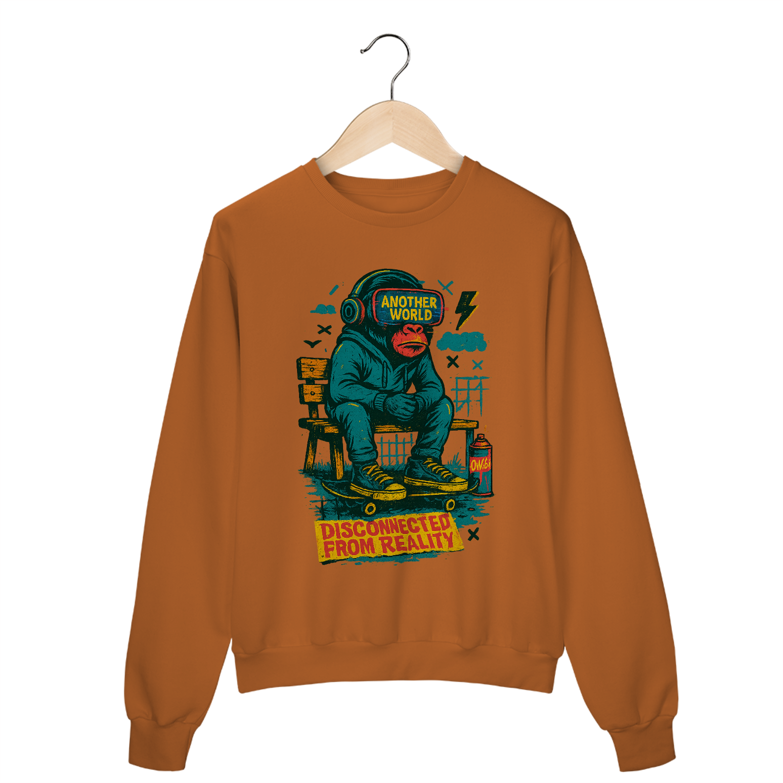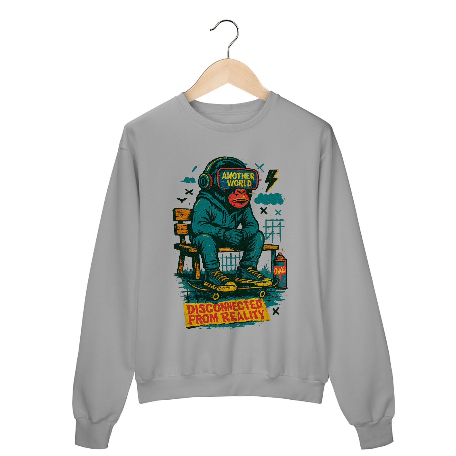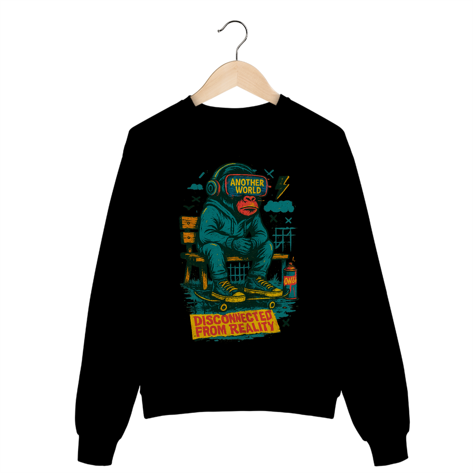 A estampa apresenta um macaco em composição gráfica provocadora, criando uma metáfora visual sobre alienação, tecnologia e distanciamento da realidade. A arte mistura linguagem urbana, humor ácido e crítica social, resultando em uma estética alternativa com forte presença visual.